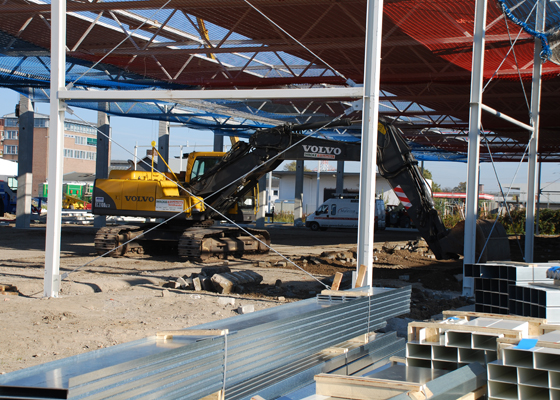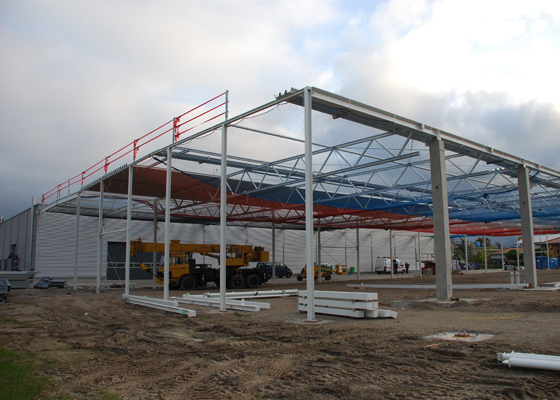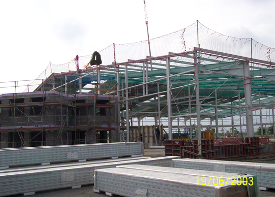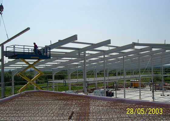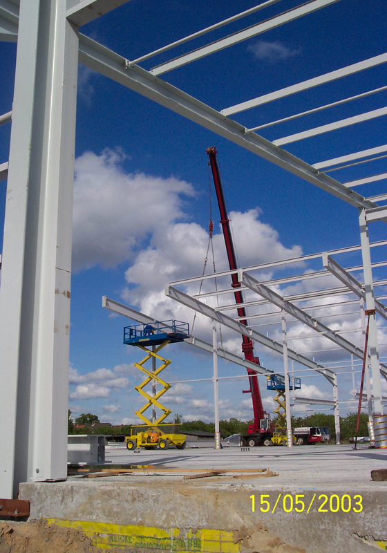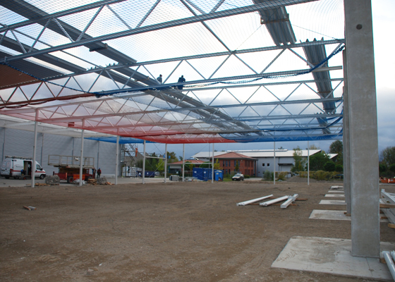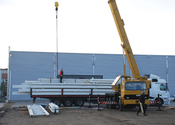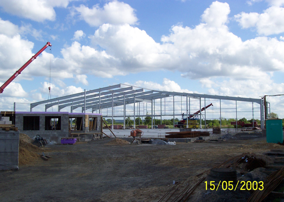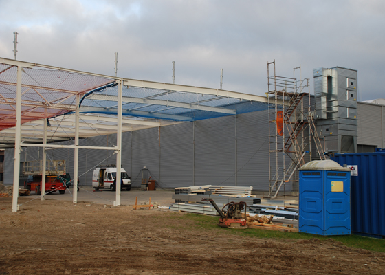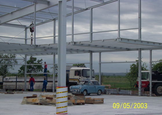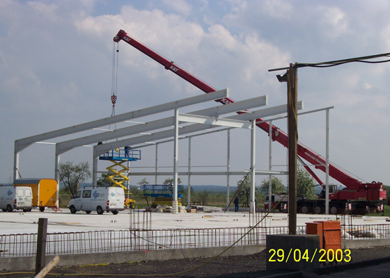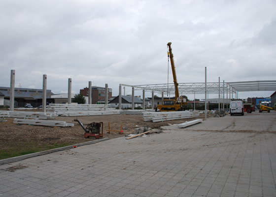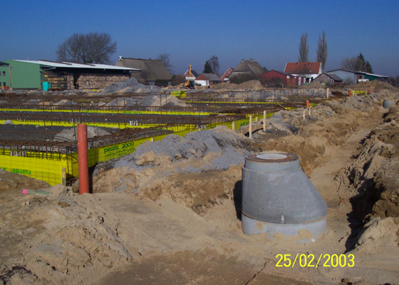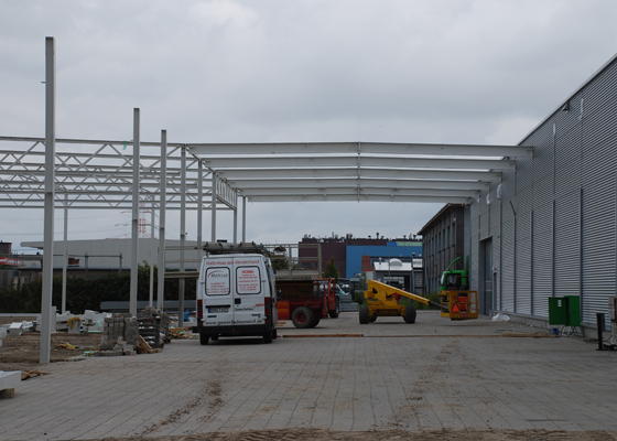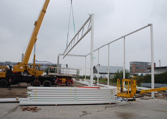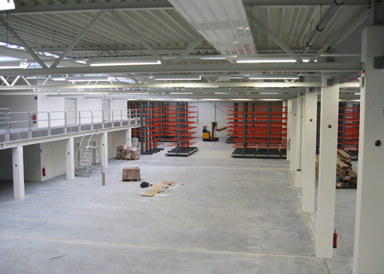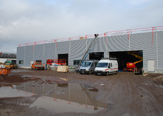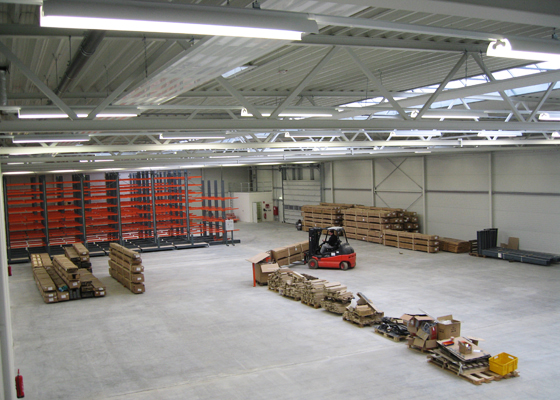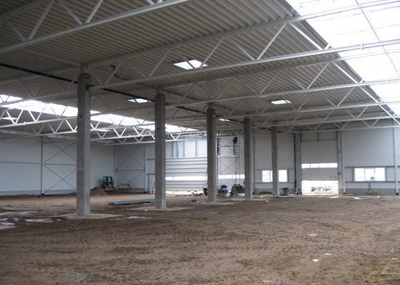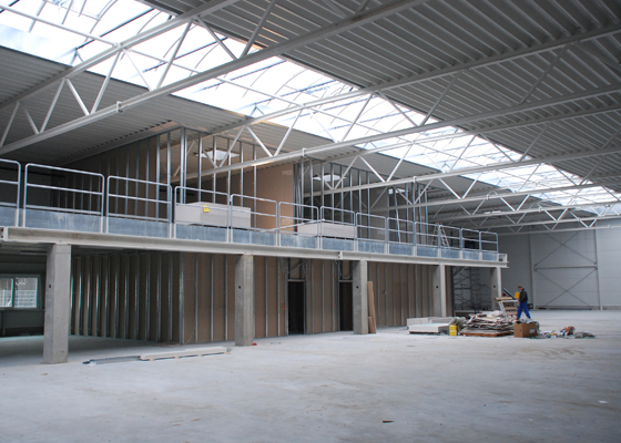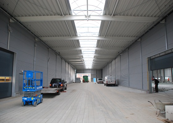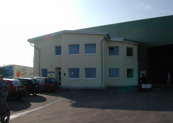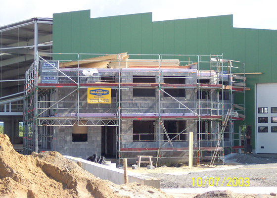 Mit der Planung des Bauwerks wurde mir gleichzeitig die Erstellung eines Wegeplanes und eines Funktionskonzeptes der Hallennutzung für ein produzierendes Gewerbe übertragen. Alle Arbeitsbereiche wurden mit Ihren Arbeitsabläufen und Maschinen aufgenommen, analysiert und in ein Wege- und Funktionsplankonzept aufgenommen, sowie in Zusammenarbeit mit den Mitarbeitern optimiert. Gleichsam ist die Bestückung der Halle, und die Außenanlagenplanung in das Konzept eingeflossen, um auch die von Außen in die Funktion eingreifenden Gegebenheiten optimiert einfließen zu lassen. Die Halle wurde aus einer Stahlkonstruktion mit Außenwandpaneel mit nur drei Stützenachsen gefertigt, die eine variable Funktion der Halle auch in Zukunft zuzulassen. Das massiv errichtete Bürogebäude gliedert sich mit den Sozialräumen der Halle an und wird mittig durch eine großzügige Eingangshalle mit Besprechungsräumen betreten. Jeweils links und rechts zu der Eingangshalle befinden sich Großraumbüros, die zukünftig eine großflächige weitere Umgestaltung der Arbeitsräume zulassen. |